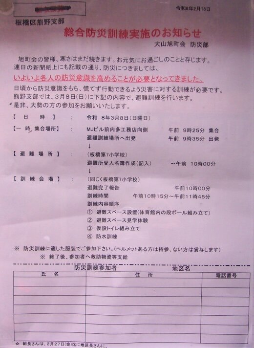 総合防災訓練実施のお知らせ(令和8年3月8日)[大山旭町会]/板橋区