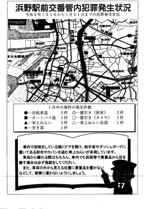 浜野駅前交番管内犯罪発生状況(令和8年1月1日〜31日)