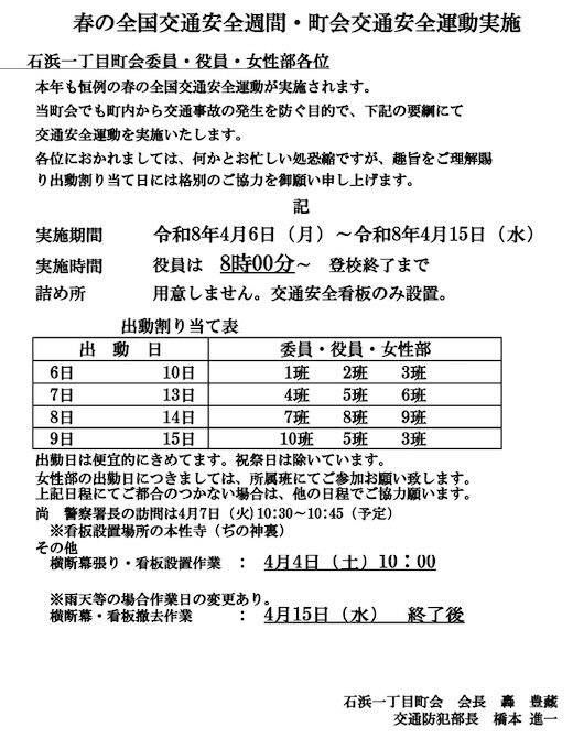 春の全国交通安全週間・町会交通安全運動実施(令和8年4月6日〜15日)