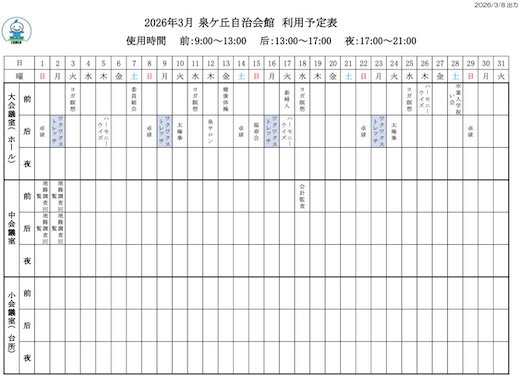 泉ヶ丘自治会館 利用予定表(令和8年3月)