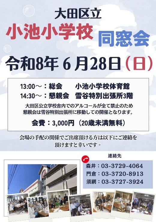 大田区立小池小学校同窓会のお知らせ(令和8年6月28日)