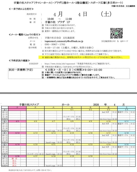 令和8年 手賀の杜自治会施設 4月分の予約