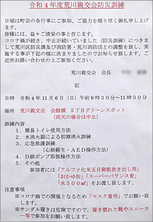 皆様には、益々ご清栄の事と存じます。コロナ禍が続き、中止が続いていました(防災訓練)につきまして荒川区防災課及び消防署・荒川消防団との調整を致し、実施する事が下記の様に決まりましたのでお知らせ致します。ご近所お誘い合わせの上ご参加ください。
