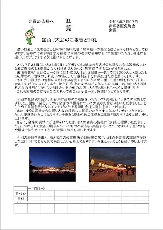 今回の盆踊り大会は、上谷津町会様のご理解をいただいて「共催」という形での実施となりました。開催に至るまでの打合せや準備等について大変なお骨折りをいただきました。あらためて共催を受け入れていただいた上谷津町会様に御礼を申し上げます。 また、多くの皆様から盆踊り大会の趣旨にご賛同いただき多大なお祝いをいただきました。大変感謝いたしております。今後とも変わらぬご厚情とご厚誼を賜りますようお願い申し上げます。