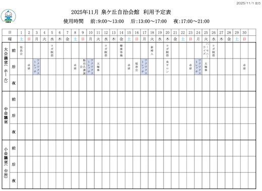 - 泉ヶ丘自治会館 利用予定表(令和7年9月)