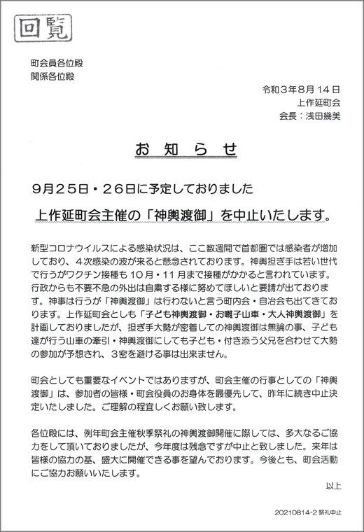 各位殿には、例年町会主催秋季祭礼の神輿渡御開催に際しては、多大なるご協カをして頂いておりましたが、今年度は残念ですが中止と致しました。来年は皆様の協力の基、盛大に開催できる事を望んでおります。今後とも、町会活動にご協力お願いいたします。
