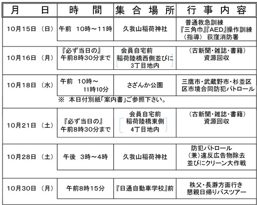 (ロ)【平成29年7月~12月 防犯パトロール・防災訓練予定表】にて10月7日(土)午後3時より防犯パトロール予定案内致しましたが、当日は、久我山稲荷神社・秋の大祭が開催され、集合場所他利用不可となりますので、防犯パトロールは中止の事と致したくご連絡申し上げます。