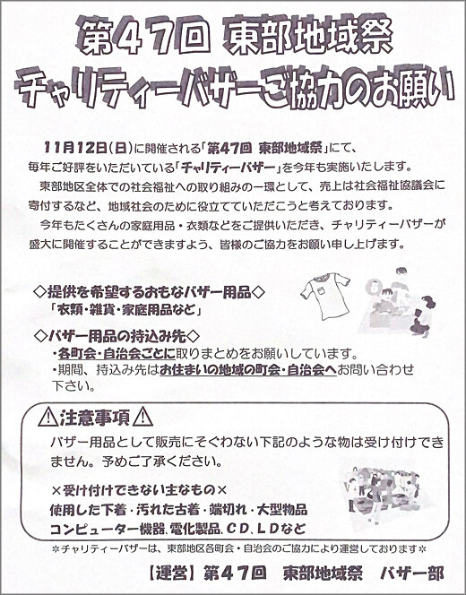第47回 東部地域祭 チャリティーバザーご協力のお願い