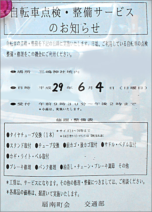 修理・整備:タイヤチューブ交換、スタンド取付、チューブ交換、前カゴ・後カゴ取付、サドル・ペダル取付、カギ・ライト・ベル取付、ブレーキ修理、パンク修理、油差し・チェーン・ブレーキ調節、その他