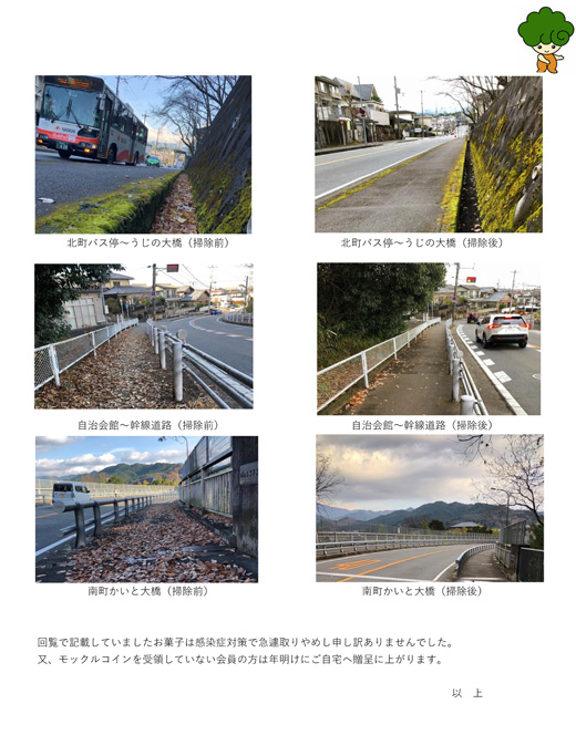 回覧で記載していましたお菓子は感染症対策で急遽取りやめし申し訳ありませんでした。又、モックルコインを受領していない会員の方は年明けにご自宅へ贈呈に上がります。