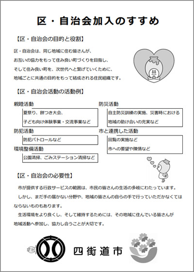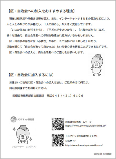 千葉県四街道市の公式ホームページでは、「区・自治会加入のすすめ」のチラシが掲載されています。