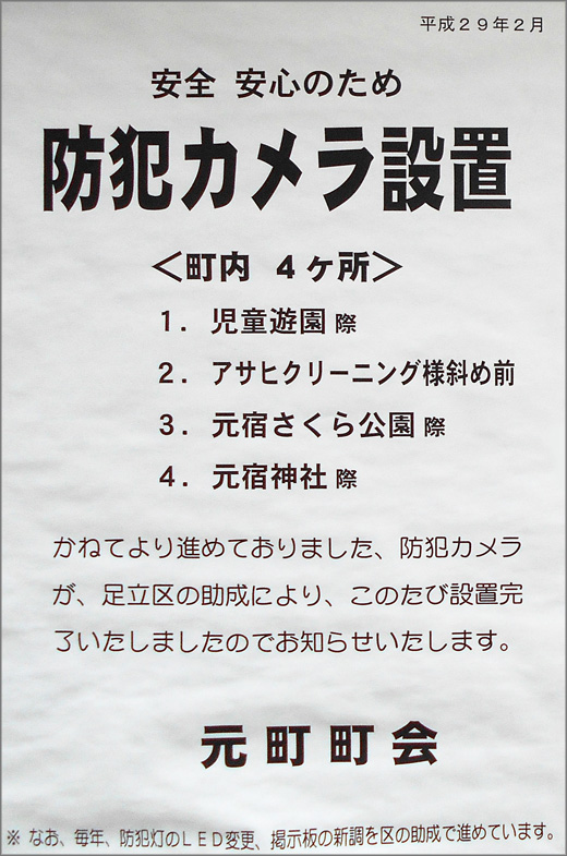 かねてより進めておりました、防犯カメラが、足立区の助成により、このたび設置完了いたしましたのでお知らせいたします。