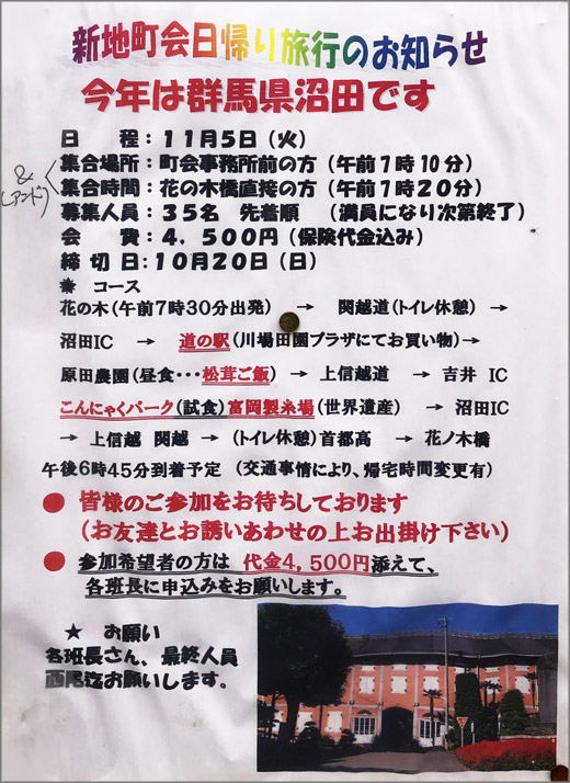 新地町会日帰り旅行のお知らせ~今年は群馬県沼田です~(令和元年11月5日)