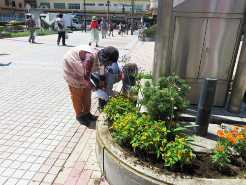 えきひろの花こみちの皆さんが、新小岩駅南口駅前広場の花壇のお手入れをされていました。季節ごとのお花とデザインを考えて、通行する方々に楽しんでもらいたいとの活動です。