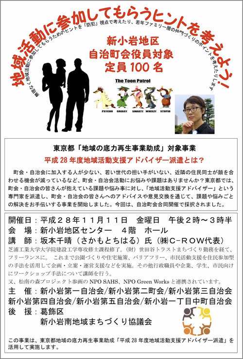 この事業は、東京都地域の底力再生事業助成「平成28年度地域活動支援アドバイザー派遣」を活用して実施します。