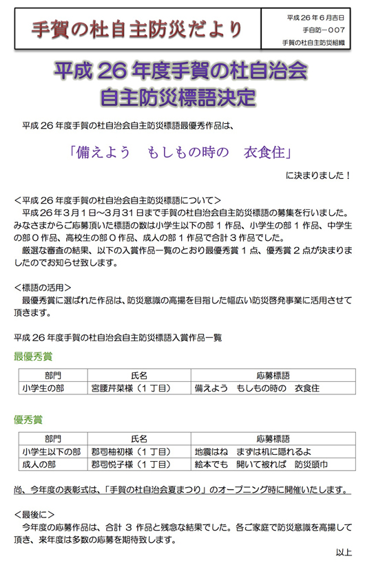 自主防災だより 007号〜平成26年度手賀の杜自主防災標語決定〜